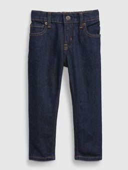 Detské džínsy s vyšším pásom a hnedým prešitím. Klasické zapínanie a pútka na opasok. Neopraná tmavo modrá farba.