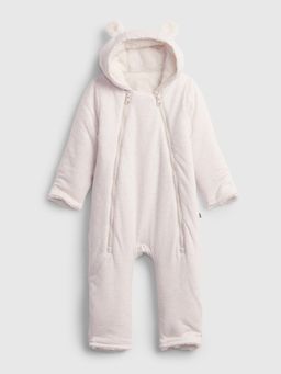 Zimný dojčenský overal GAP. Praktické zapínanie na dva zipsy. Dlhé nohavice a rukávy. Kapucňa s medvedími uškami. Overal je zateplený umelým baránkom.