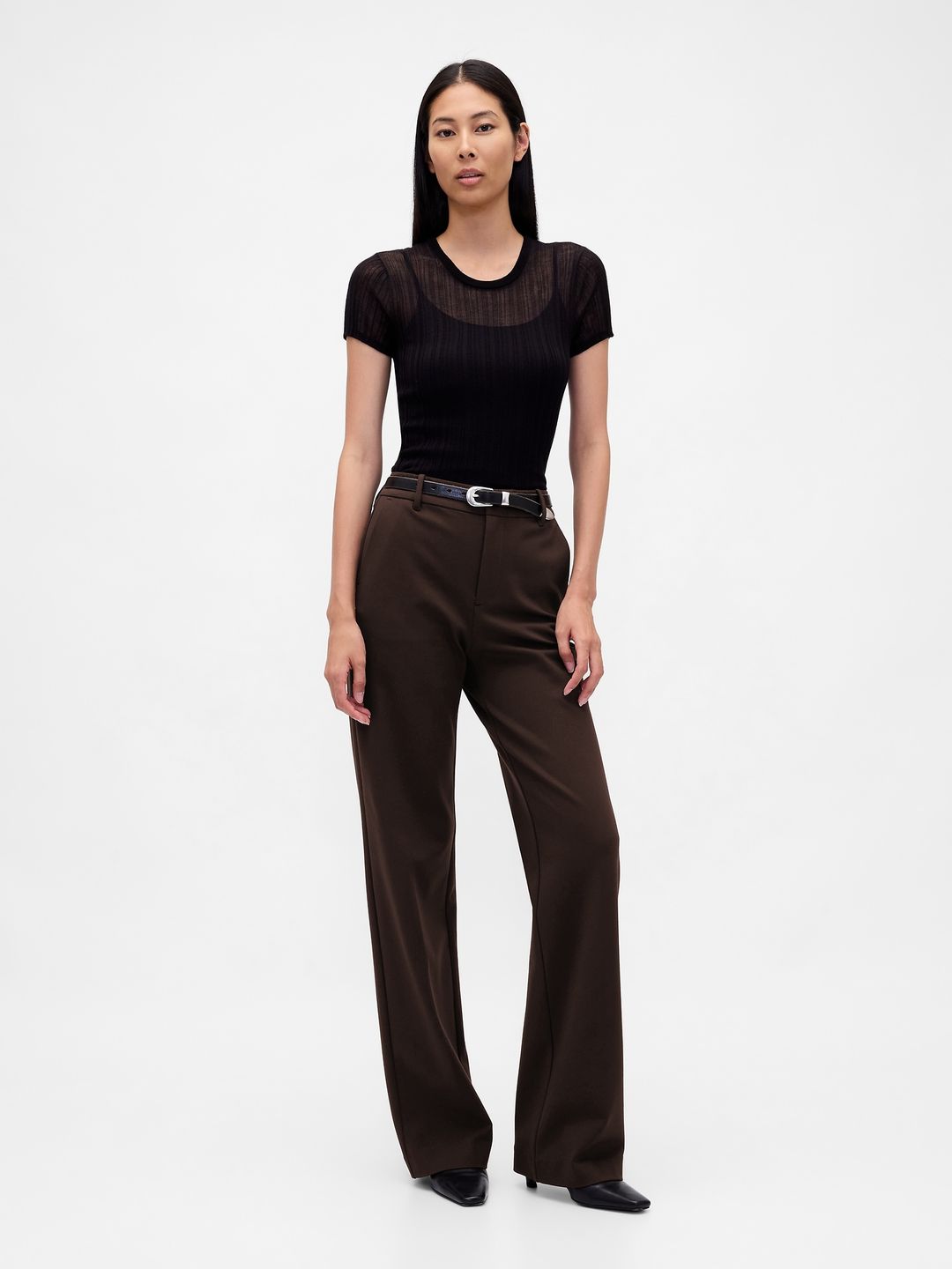 • Dámske nohavice z hladkého, mierne elastického úpletu spájajú pohodlie a elegantný vzhľad.