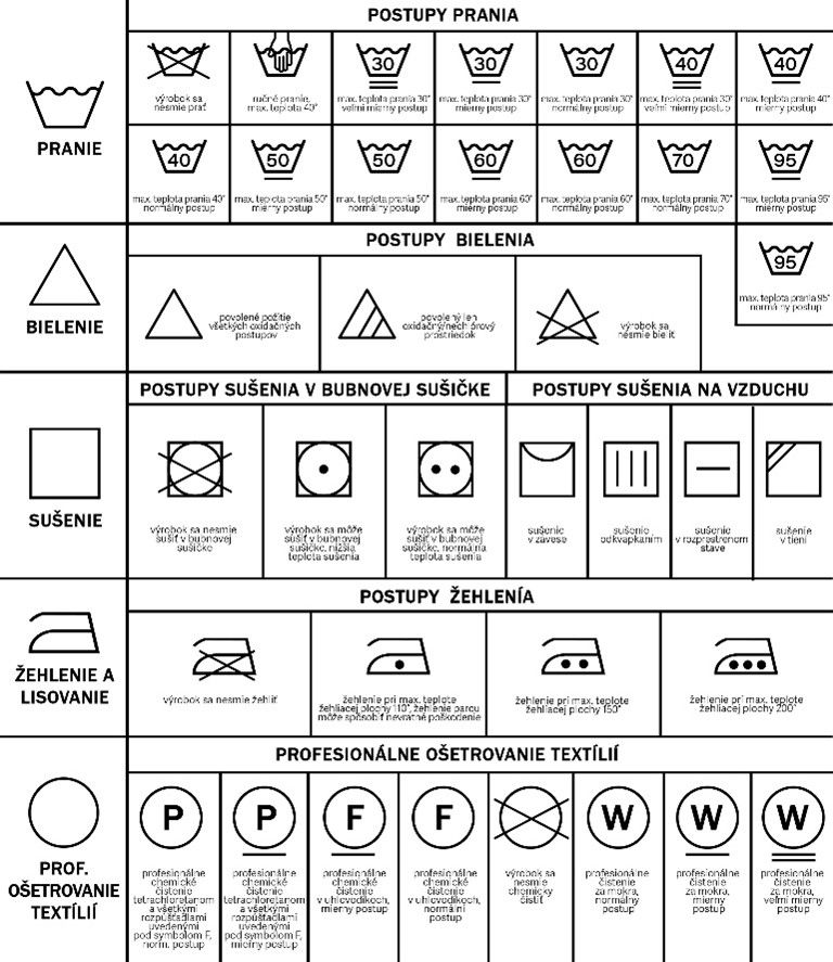 Skôr ako začnete s ošetrovaním textilu, porovnajte symboly s vysvetlivkami uvedenými na letáku nižšie. Vždy dodržujte pokyny na etikete, ktorú nájdete prišitú na Vašom odeve.