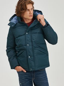 Pánska vatovaná zimná bunda s prešitím. Veľká kapucňa a vysoký golier. Zapínanie na zips s krycou chlopňou na patentky. Šikmé predné vrecká.